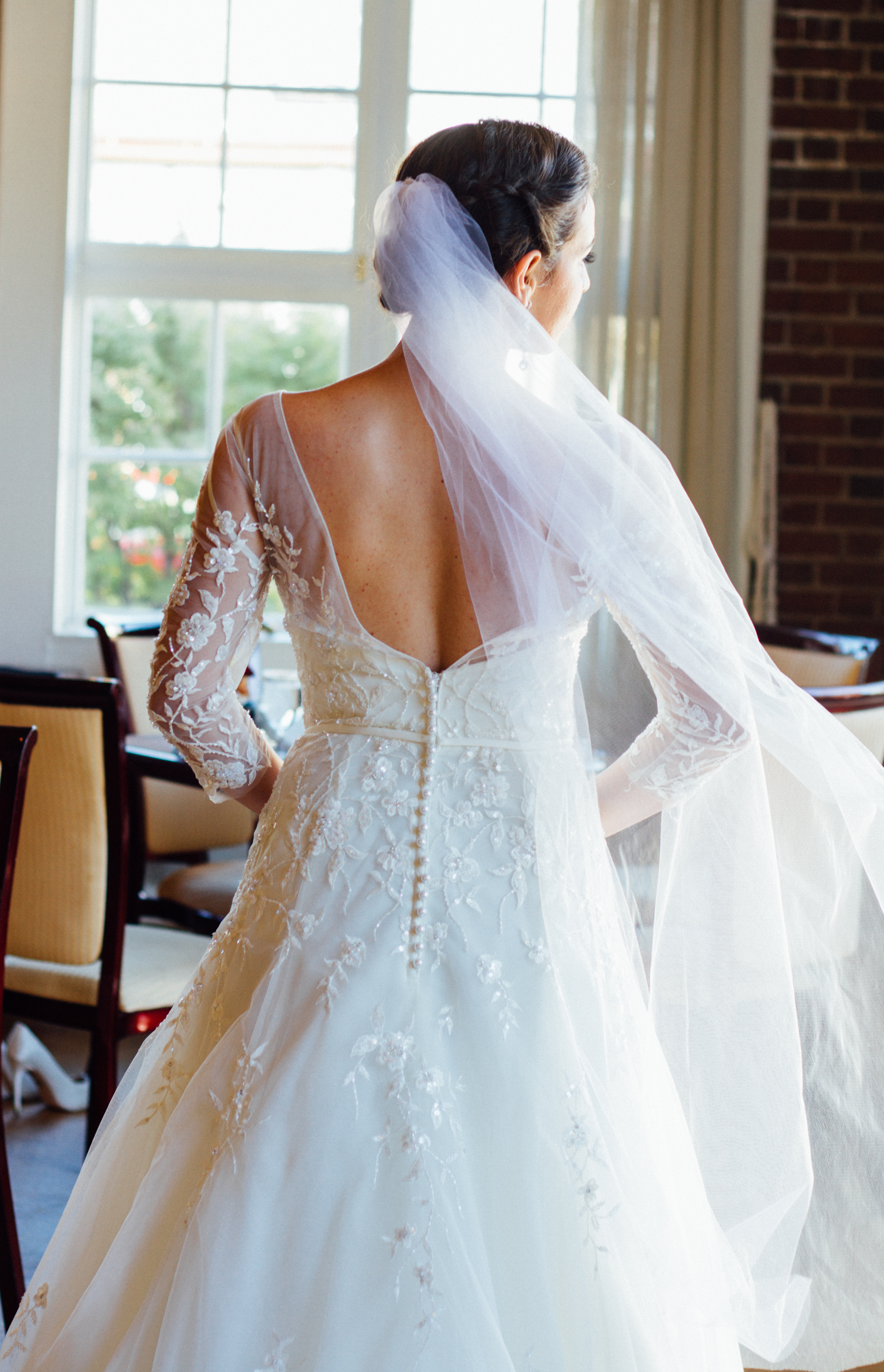 Our last look from the styled shoot at Hotel Viking is an elegant 3/4 sleeved beaded gown. The elegant details and striking back make this a gown fit for a queen. A little girl even asked if she was a princess! Based on these pictures, I’d say yes!