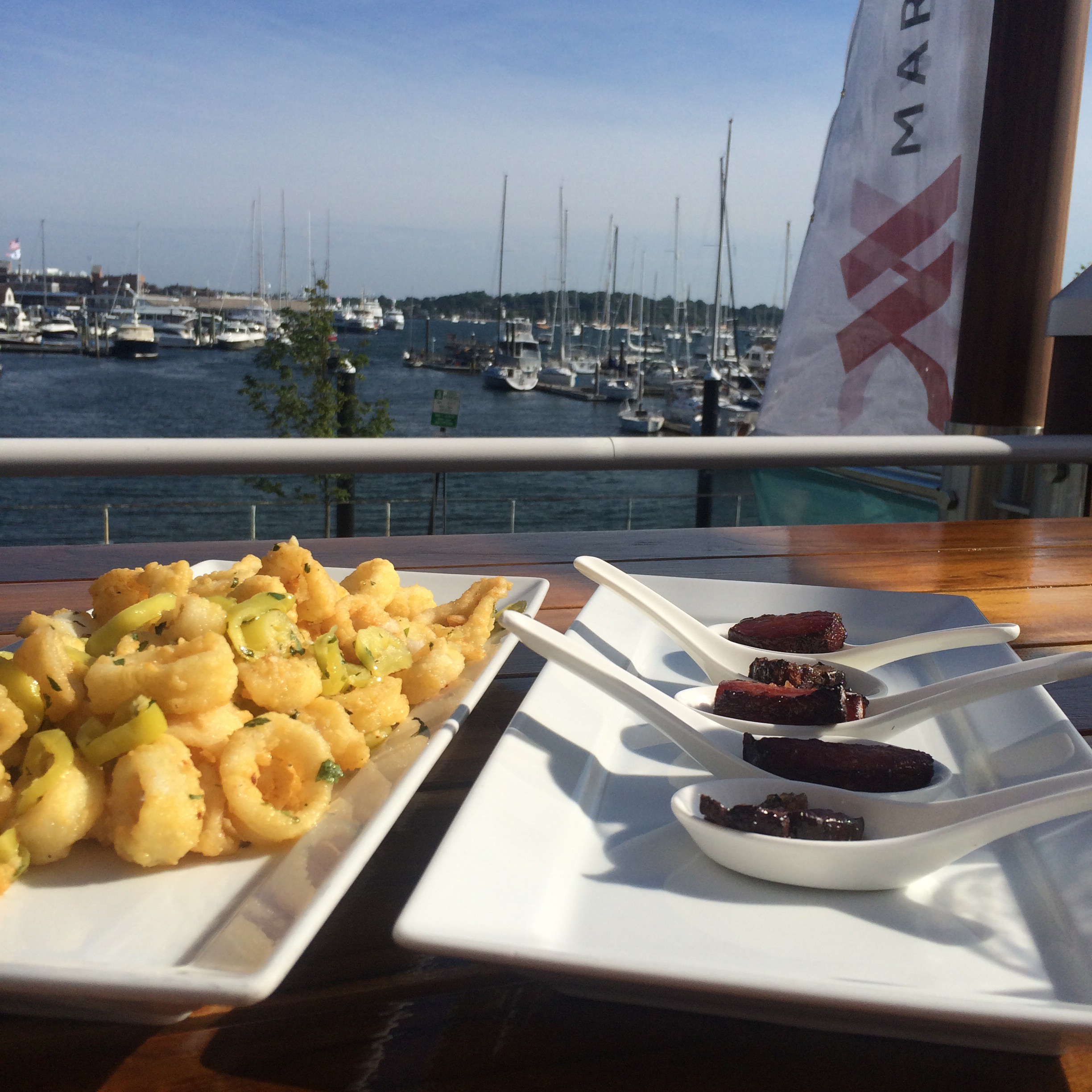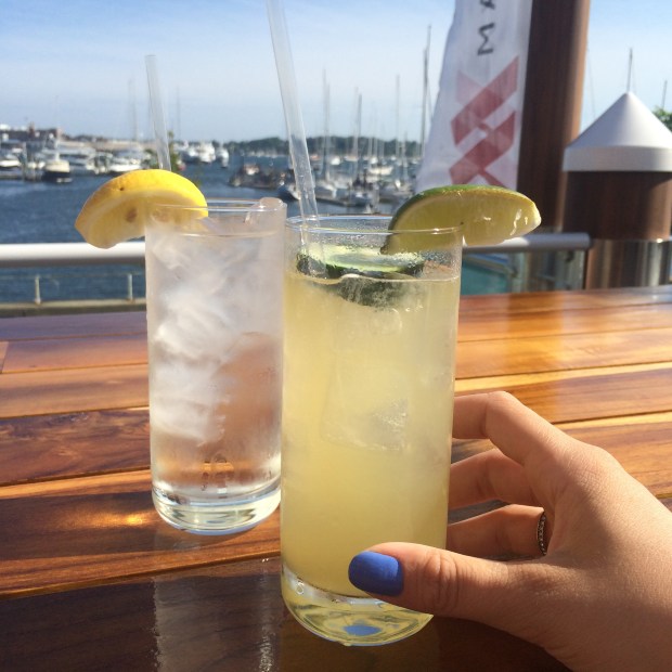 After unpacking, taking a quick snooze and ogling the super cool light fixtures, of which this hotel is full, the hubby was STARVING (does your S.O. get hangry too) so we went down to the SkiffBar to enjoy the view and some treats. We tried the banana pepper calamari and the candied bacon pops. Oh my sweet baby Jesus, the candied bacon pops. Big ol’ hunks of bacon browned in sugar and salt… It’s all my favorite things in one. Anytime the hubby and I can sit by the sea with something fruity in one hand and something bacon in the other, I’m a happy girl.