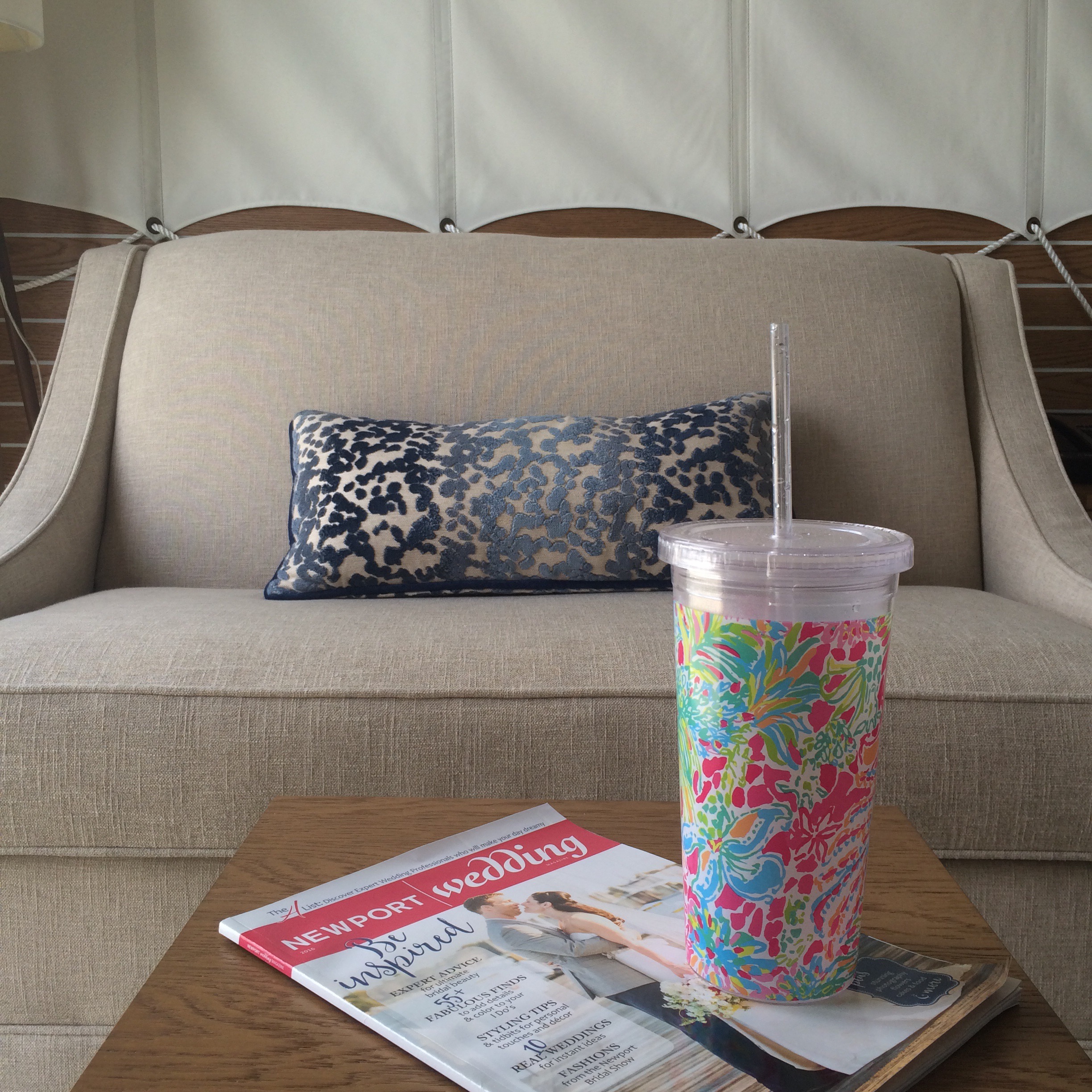 Whenever I travel I like to take a few homey items with me to make make the new space feel familiar. This time I brought my favorite travel cup (it’s easier to drink more water when it’s wrapped in Lilly P.), a copy of Newport Wedding Magazine, and my pillow. My pillow was looking so comfy and with the sound of the gulls coming through the open window, it was naptime. Perfection.