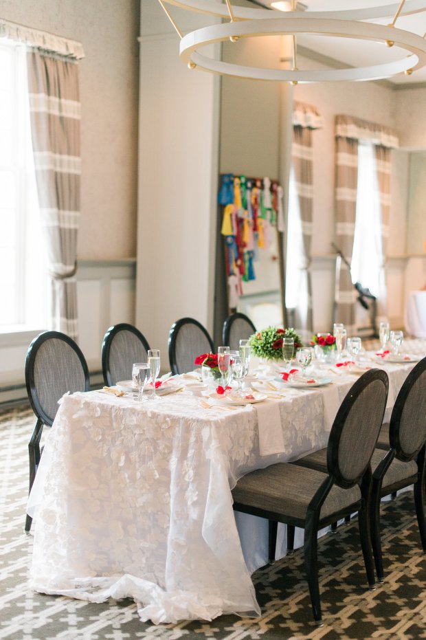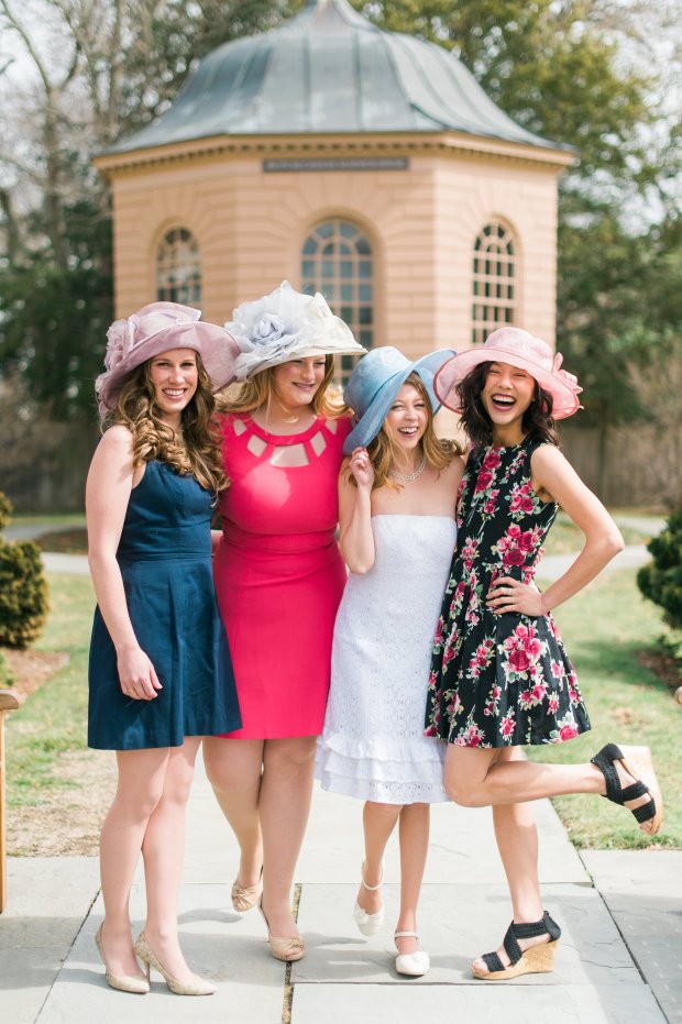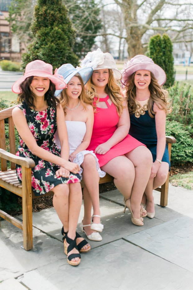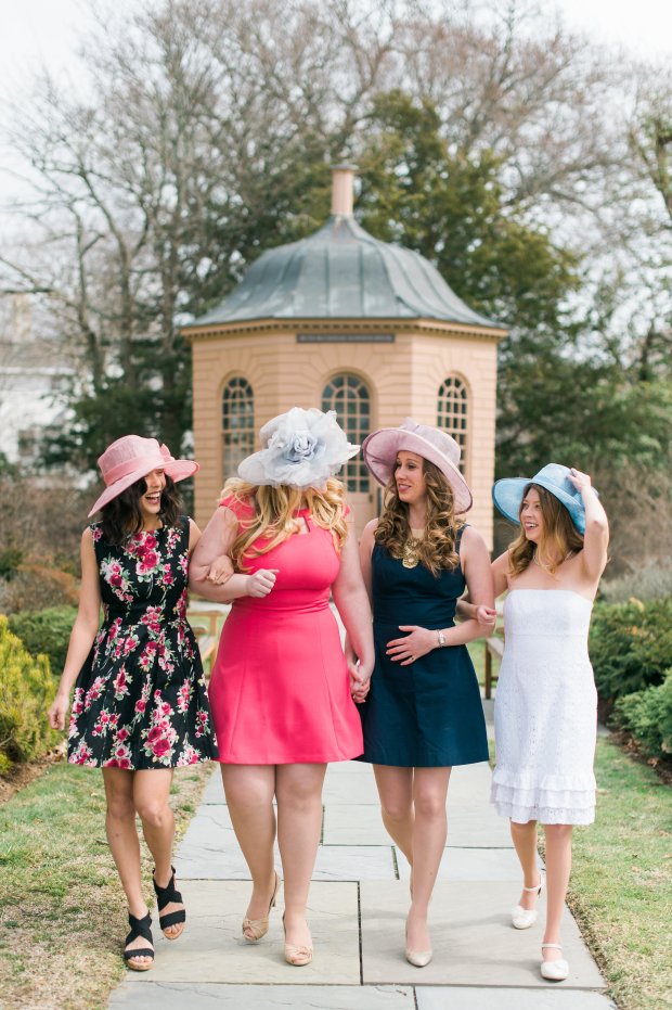 Catherine Threlkeld Photography captured our vision and brought it to life! Hotel Viking was gracious enough to let us use the Colonade Room for out set up. Newport Sweet Shoppe created horse shoe cookies that were beautiful and delicious. Julie Rose helped our models, Monica, Kristen, Claire, and Joanna look their best with fresh and natural hair and makeup. The adorable cake and cupcakes were created by Wingate’s Cake. The water color sign is by Oh Capri Studio and Harbor Stationary created the invitation suite, table number, and place card for the bride. The beautiful rental furniture, china, and flatware is by Uniquely Chic Vintage Rentals and the stunning lace cloth, the one that we want to keep forever and ever, is from D’Paulo Designs and Linens. The horse statue and fun hats are from Newport Style. We borrowed the horse ribbons from That Newport Show‘s Helena and her daughter. Many things to the talented vendors that made this shoot possible! Happy bridal shower dreaming and happy derby day!