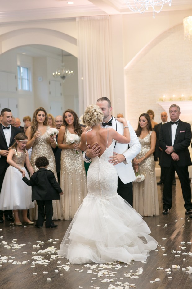 Kristin and Derek’s vision of a romantic old hollywood glamour wedding came to life in Belle Mer’s Water Salon. Captured by Jaclyn L Photography, this elegant wedding combined glittering golds and crisp whites for a timeless feel. With her Monique L’Huillier gown with a delicate lace bodice and full trumpet skirt, killer Jimmy Choo – Lana shoes, hair and makeup from Phillip DePalma Salon Hair, and a pure white orchid bouquet from Blooms of Boston, Kristen was a stunning bride from head to toe. Her maids in gold Adrianna Papell gowns set the tone for what was to be a glitz and glam affair. The groom wore a white diner jacket pipped in black and looked oh so dapper. To finish off what looks to be a killer dance party, the couple even brought in Boston Cigar Factory for hand rolled cigars.
