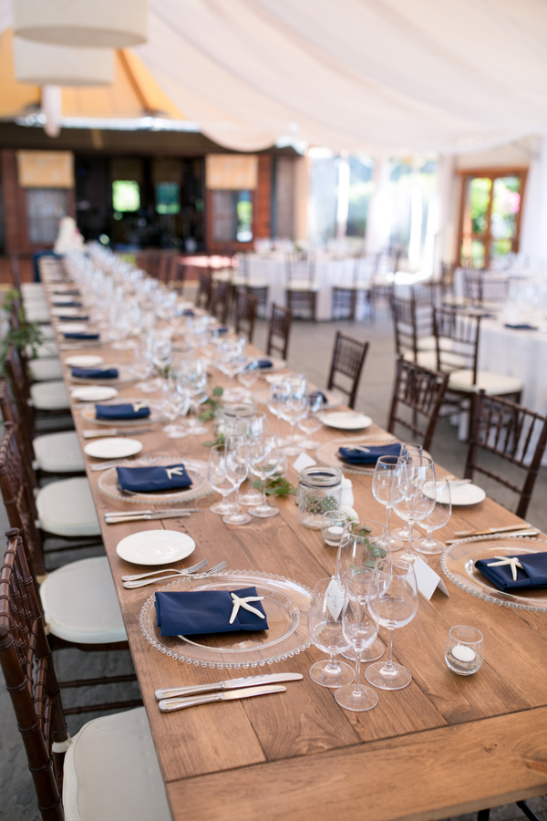 Using Pinterest as their mood board, the couple designed a preppy nautical wedding focusing on the New England staple color of wedding for all seasons, navy, and rustic nautical elements like their table numbers. What used to be identification numbers on docks got a unique new life as table numbers for this seaside wedding. Rather than going with a chronological sequence, each of the table numbers was a number significant to their relationship. They used a boat as an escort card display and a lobster trap as a card basket.