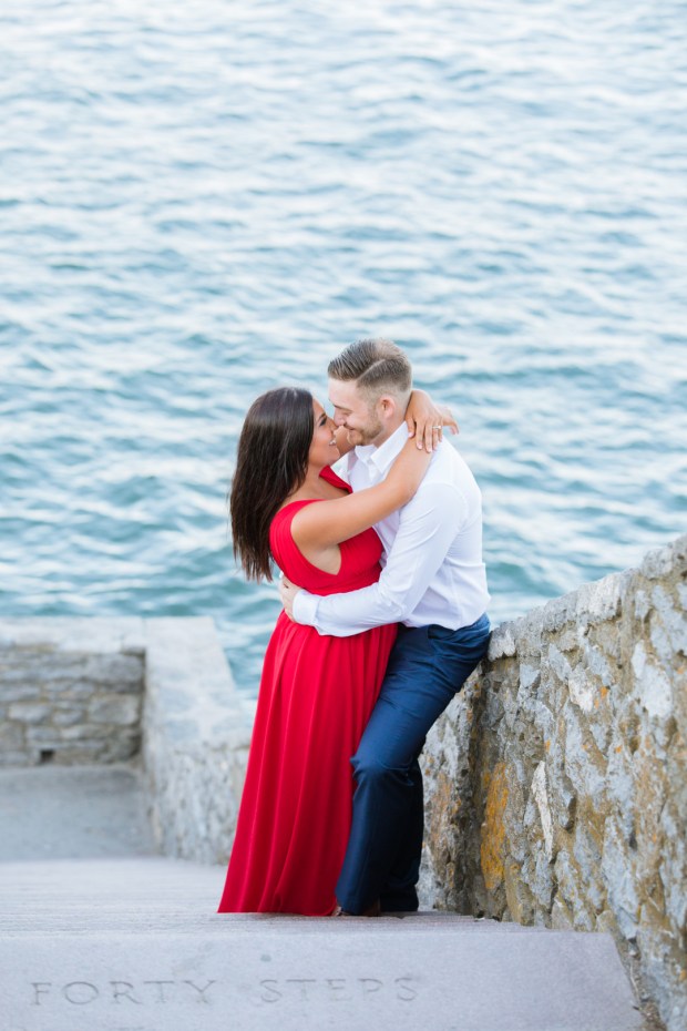 Geno rented a private yacht out of Newport, and right there in the middle of the ocean, he popped the question! Both their families were watching from above and they couldn’t wait to celebrate! When it came time to plan the engagement photos they chose Forty Steps and 1st beach in Newport so as to have a mix of both formal and relaxed poses. Their red white and blue nautical tones for the first half of their session provided a dramatic contrast against the stunning Rhode Island water. The two affectionately snuggled and laughed through their session, which made them a dream for Trish Kemp Photography to photograph.