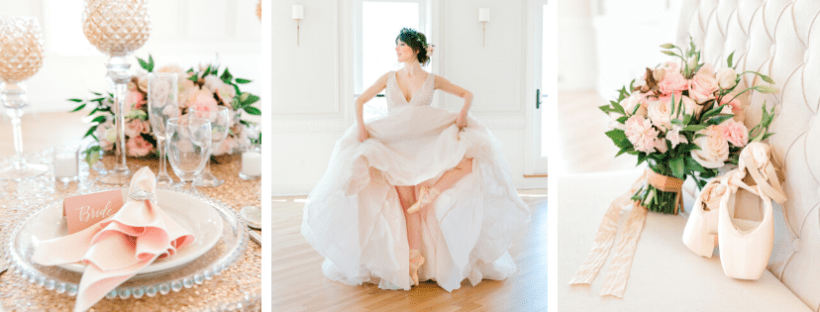 There’s nothing more romantic than the grace and beauty of a ballerina on her wedding day! The grace, beauty, and charisma of ballet dancers inspired this styled shoot. The color palette was pale blush and mint with LOTS of sparkles!