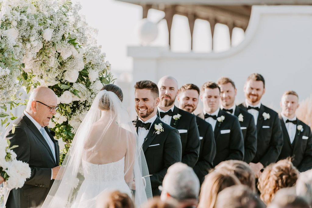 Photography: Katie Karlberg Photo | Wedding Planning: Sarah Castro | Venue: Belle Mer | Photographer: Katie Karlberg Photo | DJ: DJ Valentina | Florist: Stoneblossom | Dress Designer: Pronovias | Invitations: Minted | Engagement Ring: James Allen | Wedding Band: Barmakian | Makeup: MakeMeUp | Videography: Shutter and Sound | Live Ceremony Music: Golden Scroll Soloists | Live Painter: Alfredo J. Carlson | Bridesmaid Bracelets: Maris Pearl | Getting Ready Location: Hotel Viking